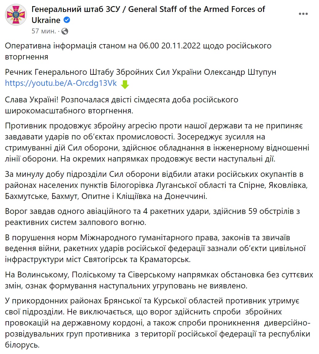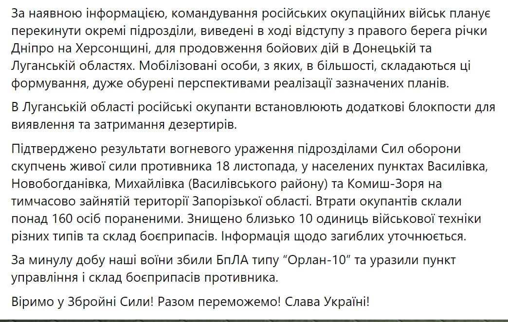08.00 Главное из сводки украинского Генштаба на утро 20 ноября: