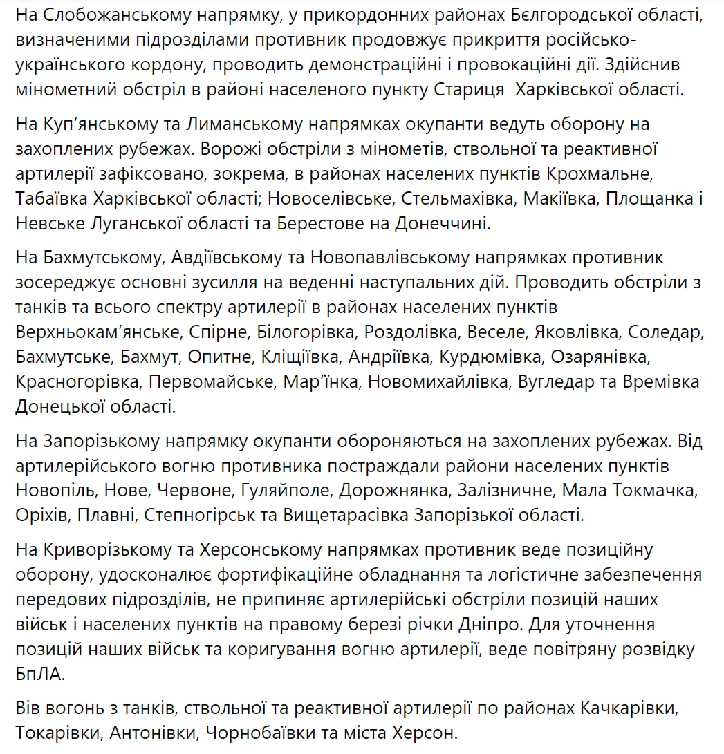 1. Атаки россиян отражены в селе Белогоровка Луганской области, а также населенных пунктах Спорное, Яковлевка, Бахмутское, Бахмут, Опытное и Клещеевка Донецкой области.