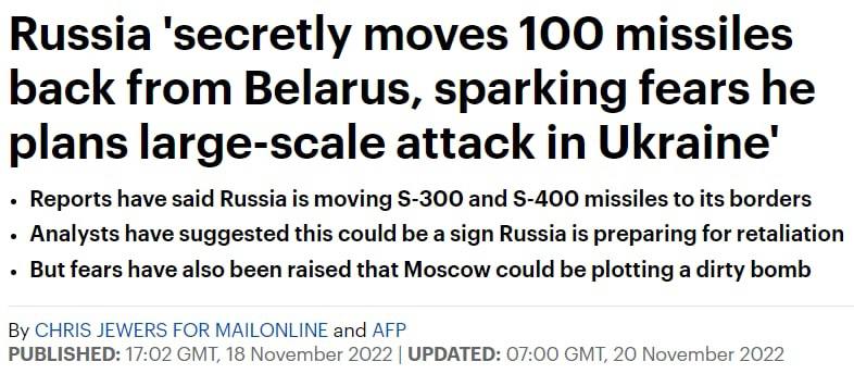 11.08 Российские военные тайно перебросили в Россию из союзной Белоруссии почти 100 ракет ПВО - вероятно, для нанесения крупномасштабного удара по Украине, предполагает Daily Mail со ссылкой на свои источники.