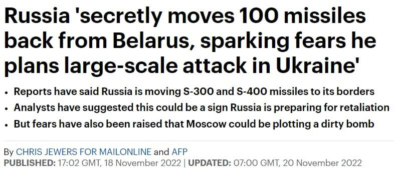 Аналитики, опрошенные газетой, предполагают, что перемещение ракет С-300 и С-400 является либо признаком того, что Россия принимает меры предосторожности против потенциального украинского удара, либо признаком того, что сама готовится нанести удар. В том числе, возможно, и "грязной бомбой".