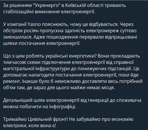 "Ситуация остается сложной, но контролируемой. Это означает, что во всех регионах продолжают применяться отключения потребителей. Действуют графики отключений.
