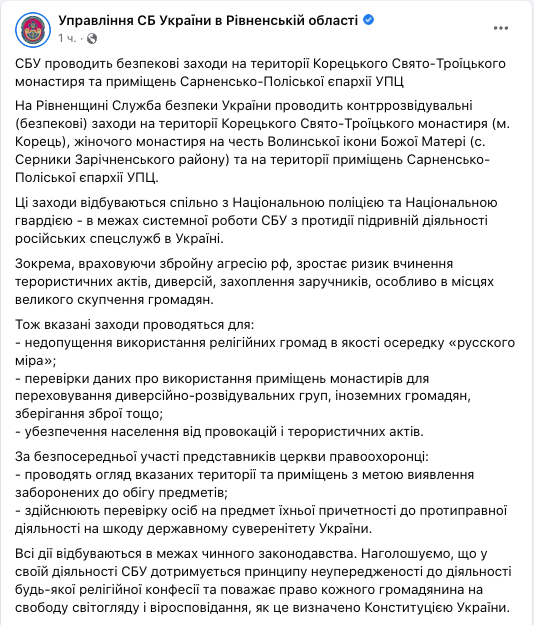 Одновременно с обысками в Киево-Печерской Лавре СБУ заявляет о проведении "контрразведывательных мероприятий" в нескольких монастырях УПЦ в Ровенской области.