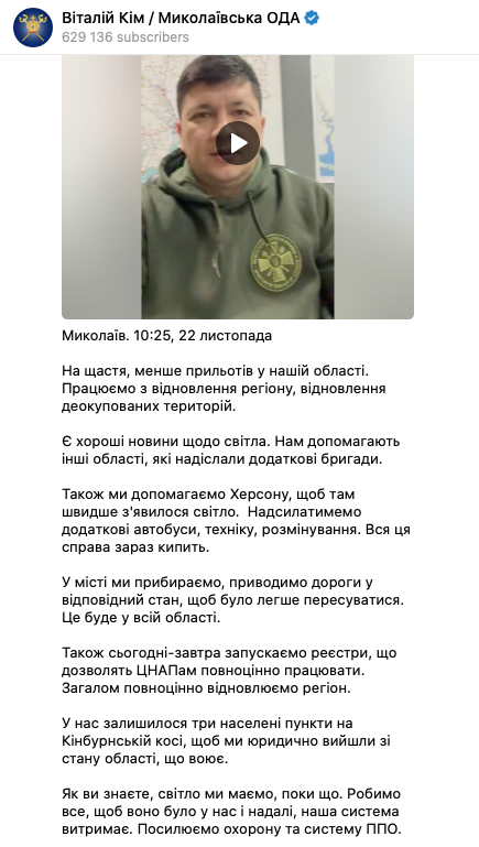 "У нас осталось три населенных пункта на Кинбурнской косе, чтобы мы юридически вышли из состояния воюющей области", - пишет Ким.