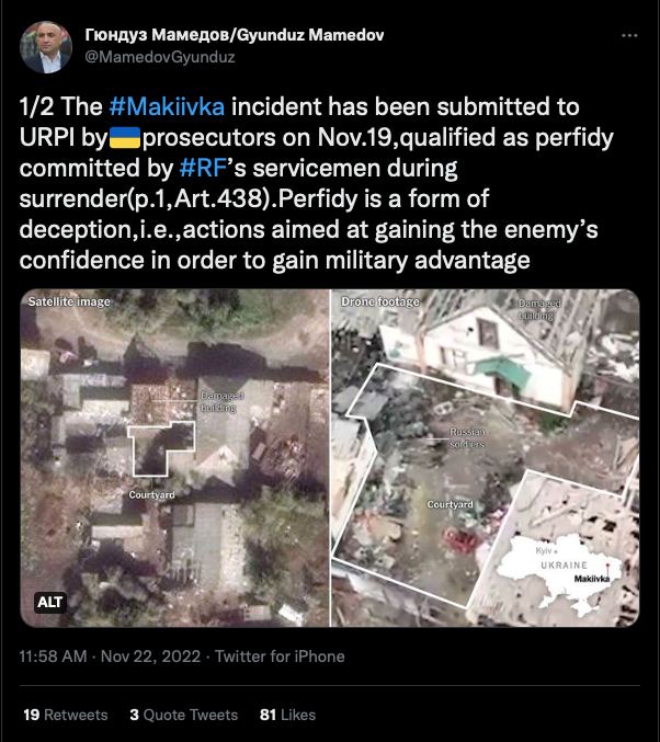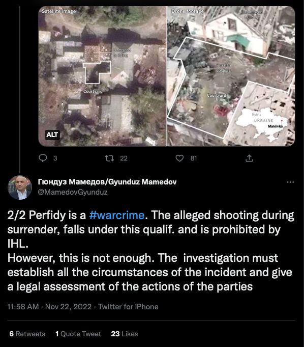 "Вероломство является формой обмана, т.е. действия, направленные на завоевание доверия противника с целью получения военного преимущества. Вероломство - это военное преступление. Предполагаемая стрельба во время сдачи в плен подпадает под эту квалификацию. И запрещена МГП (Международным гуманитарным правом - Ред.). Однако этого недостаточно. Следствие должно установить все обстоятельства произошедшего и дать правовую оценку действиям сторон", - заявил Мамедов.