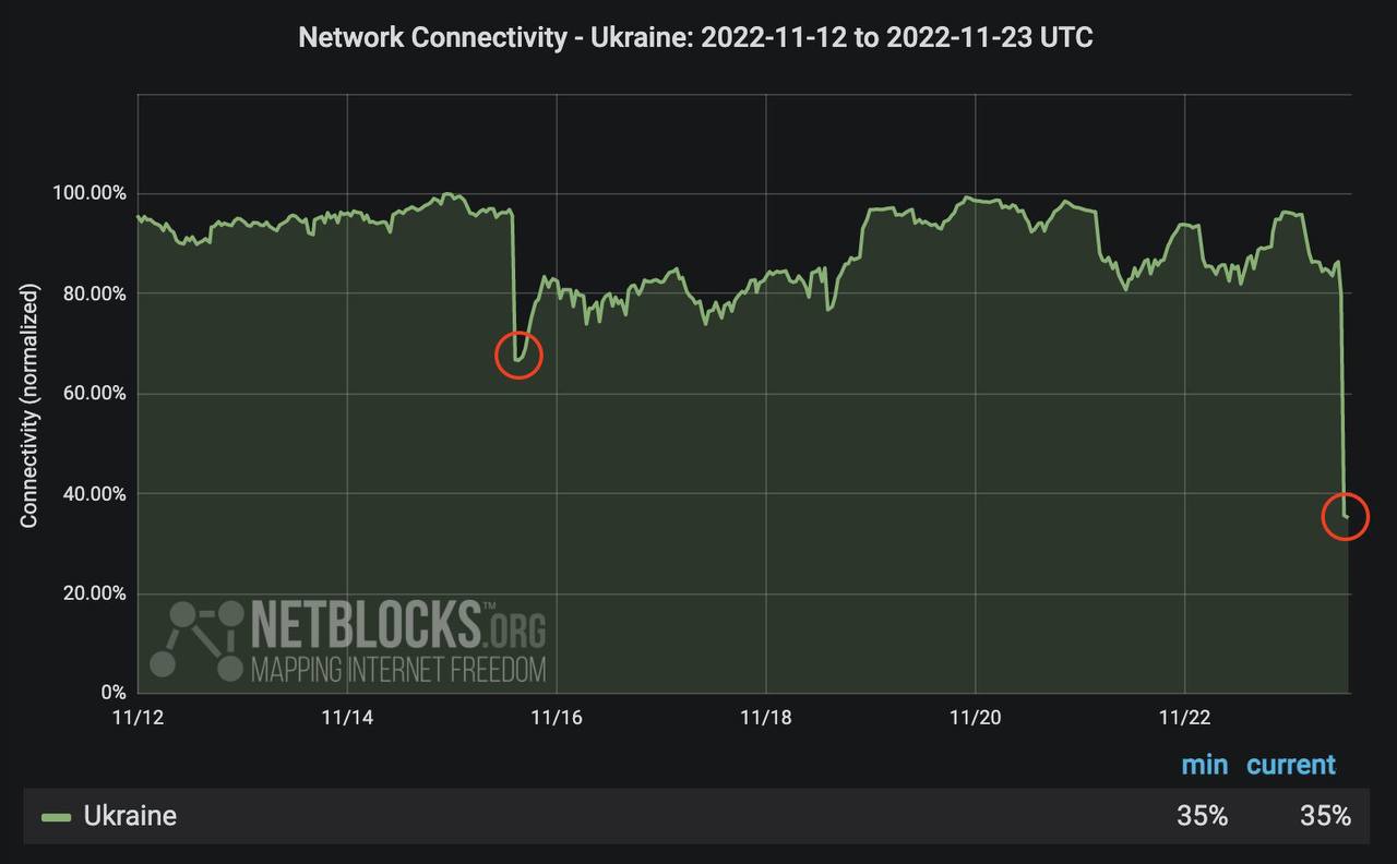 По данным Netblocks, Украина находится в эпицентре блэкаута в национальном масштабе, что сильно влияет на доступ к Интернету.