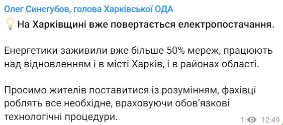 По его словам, энергетики работают над восстановлением света и в Харькове, и в районах области.