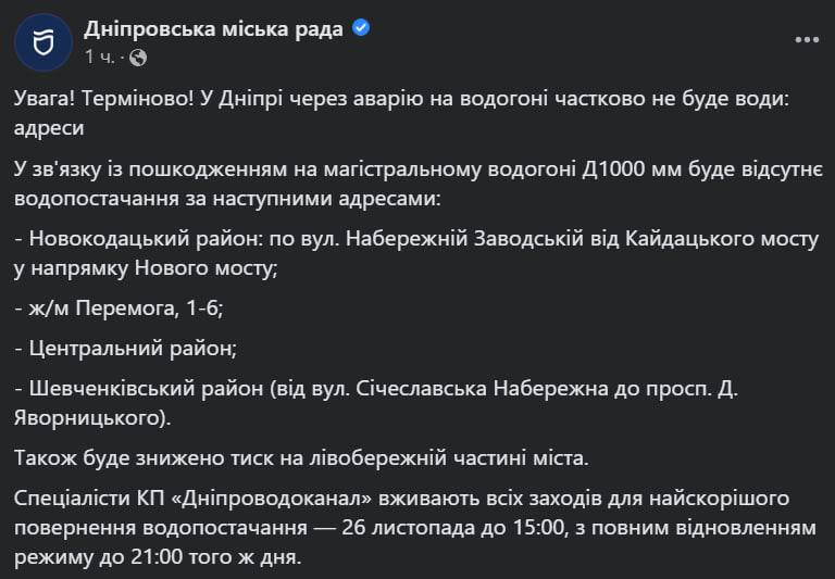 Значительная часть города Днепр на сутки останется без водоснабжения из-за аварии на водопроводе.