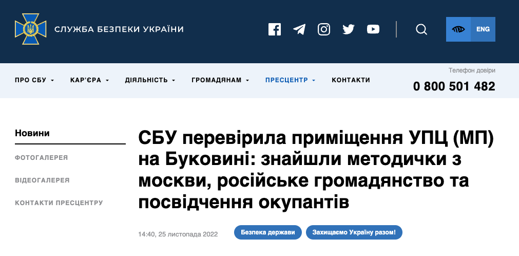 СБУ провела "контрразведывательные мероприятия" в Черновицко-Буковинской епархии УПЦ. Утверждается, что найдены "методички из Москвы" и документы, указывающие на наличие российского гражданства у руководства епархии.