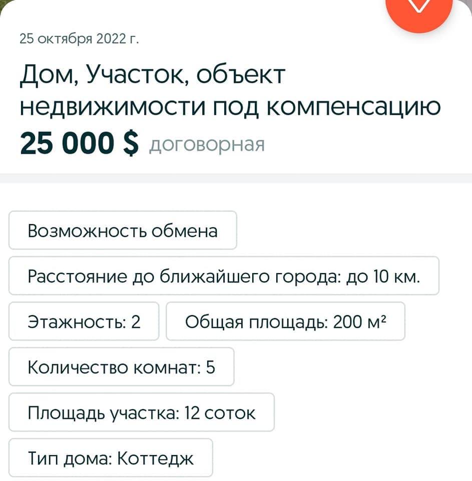 "Видимо, повреждения серьезные, потому что до войны такой дом с участком стоил примерно в 9 раз дороже. Продавец предлагает купить дом тем, кто "знает нюансы и тонкости получения компенсации и скупает поврежденные объекты". То есть можно предположить, что уже есть или будет формироваться отдельная ниша на рынке недвижимости, где будут выкупаться пострадавшие объекты с целью заработать на разнице между ценой покупки и суммой будущей компенсации", - пишет Рябов.