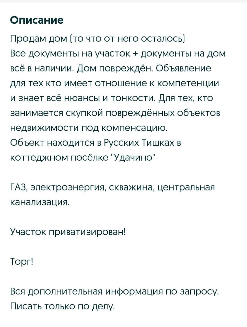 Земля приватизирована, дом построен по авторскому проекту, есть все коммуникации и даже мебель. В объявлении указано, что дом поврежден.