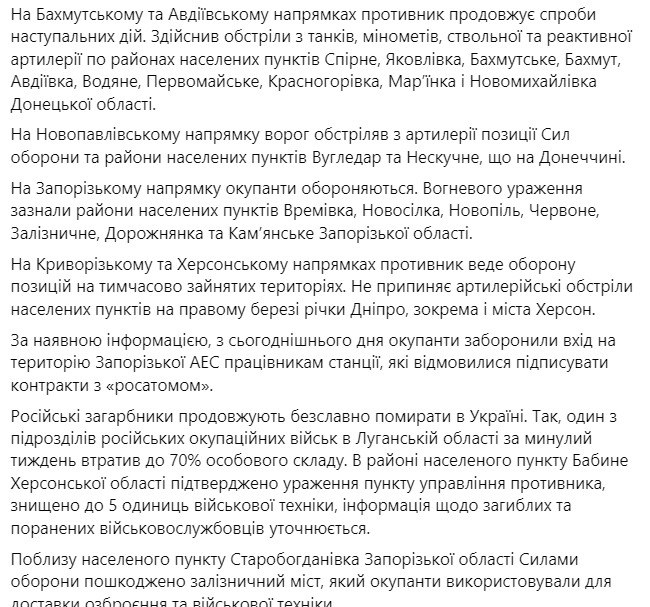 Генштаб сообщает о перегруппировке российских войск с целью усиления  на Лиманском, Авдеевском и Новопавловском направлениях. Россияне продолжают наступление на Бахмут и Авдеевку.