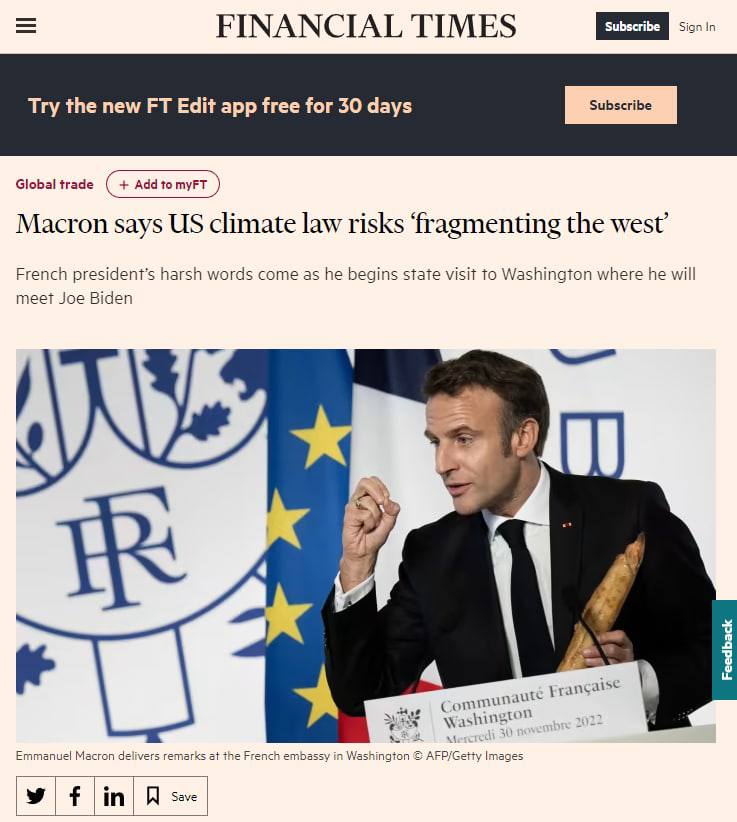 Резкие слова президента Франции прозвучали в начале его визита в Вашингтон, где он встретится с Джо Байденом. По словам Макрона, этот закон "исказит конкуренцию, массово субсидируя американские компании в ущерб европейским отраслям".