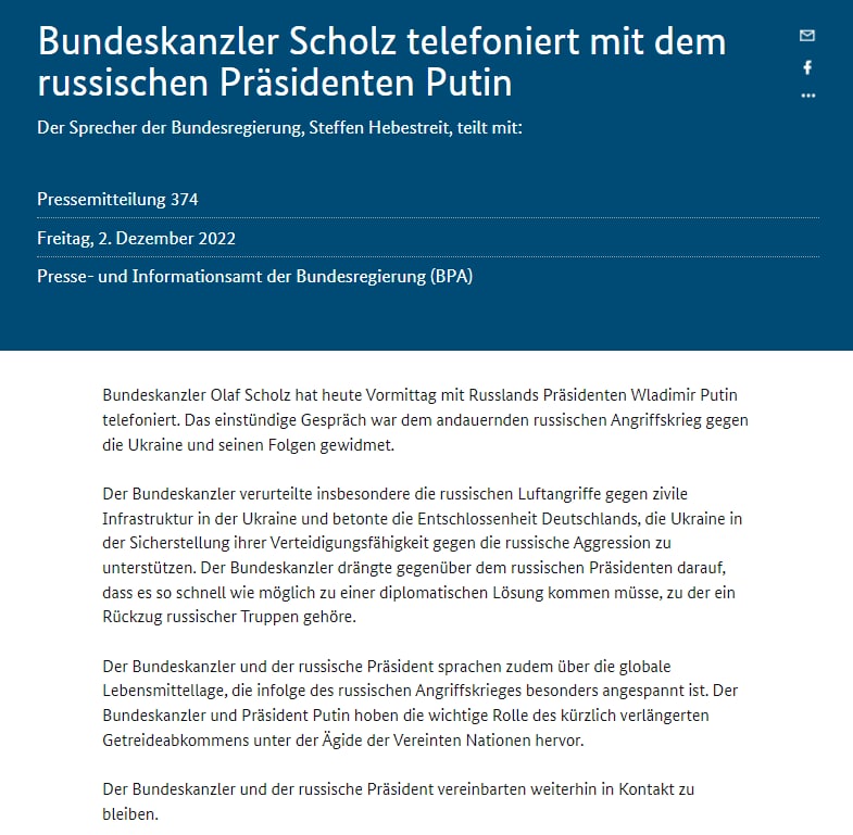 Разговор канцлера Германии Олафа Шольца с президентом РФ Владимиром Путиным, который состоялся сегодня, 2 декабря, был посвящен войне в Украине.