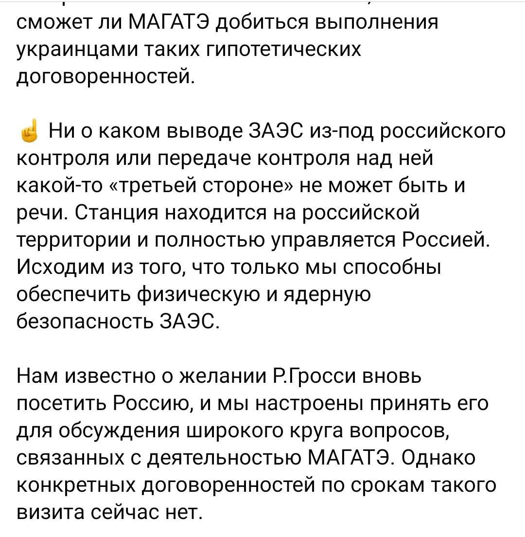 "Ни о каком выводе ЗАЭС из под российского контроля или передачи контроля "третьей стороне" не может быть и речи. Станция находится на российской территории и полностью управляется Россией. Исходим из того, что только мы способны обеспечить физическую и ядерную безопасность ЗАЭС", - заявила представитель МИД РФ Мария Захарова.