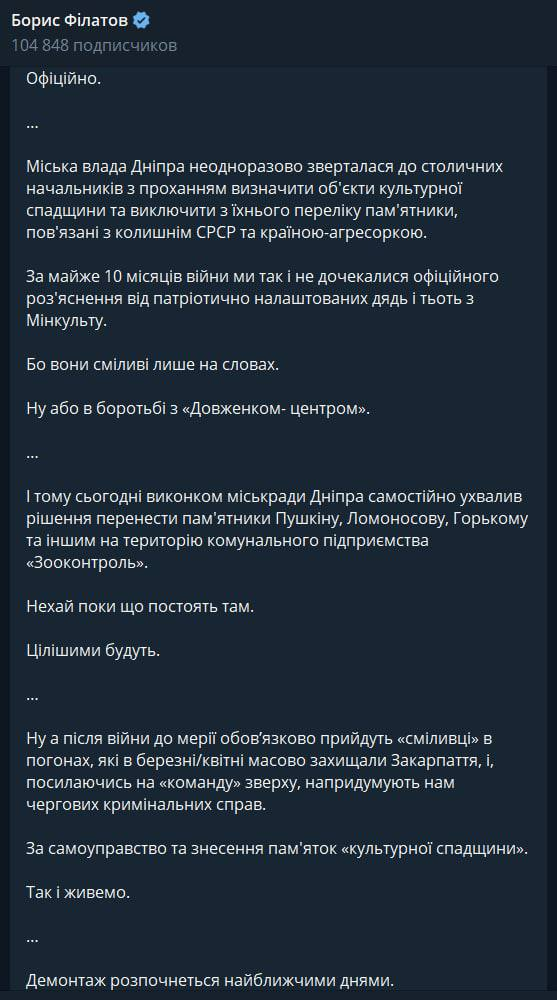 "Мы до сих пор ждем информацию от правоохранительных органов. Я считаю, это для них должно быть делом чести, потому что, на самом деле, как бы ни назывался этот памятник в народе, у него есть название. Это памятник милиционерам, потерявшим жизнь во время исполнения своих служебных обязанностей. У многих полицейских есть свои знакомые, друзья, которые потеряли своих собратьев во время выполнения своих обязанностей. Я думаю, после войны мы проведем архитектурный конкурс и восстановим этот памятник – без буденновки и меча со щитом. Но таким людям должен быть памятник, потому что это опасная работа – служить и защищать во время гражданской жизни и военной. У меня нет информации о тех, кто это совершил. Я, как и все, в ожидании публичной информации, кто это сделал, и зачем это было сделано. С другой стороны, если информация по этому памятнику кажется многим противоречивой, то есть еще второй памятник, в котором не было ни звезд, ни будённовок, ни серпа и молота. Это памятник скорбящей матери на Херсонском шоссе, он также был взорван. Это фактически могильная плита – память людям, погибшим во время Второй мировой войны. И я не хотел бы, чтобы сегодня происходили такие вещи, которые, возможно, будут происходить по отношению к памятникам тех людей, которым мы будем устанавливать мемориалы уже после этой войны", - сказал Сенкевич.