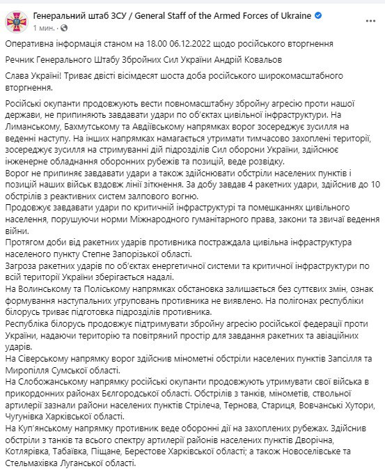 Во вторник, 6 декабря, в Украине уже 286-й день войны с РФ.