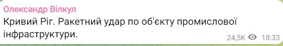 20:55 В результате ракетного удара по промышленному объекту в Кривом Роге, по предварительной информации, ранения получил один человек.