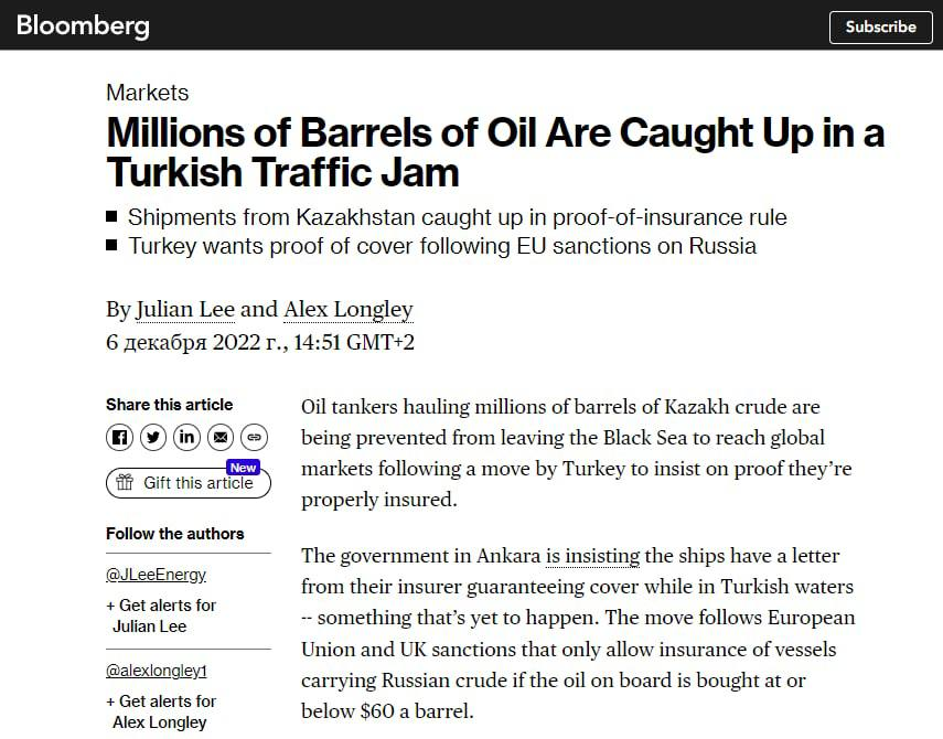 И с 5 декабря Турция для прохода танкеров через проливы требует нового подтверждения страховки. В связи с этим Россия формирует свой собственный танкерный флот, который будут застрахован не в западных компаниях.