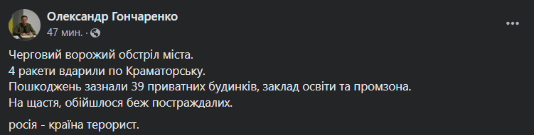 Мэр города Александр Гончаренко в своем Facebook сообщил о четырех ракетах, ударивших по городу.