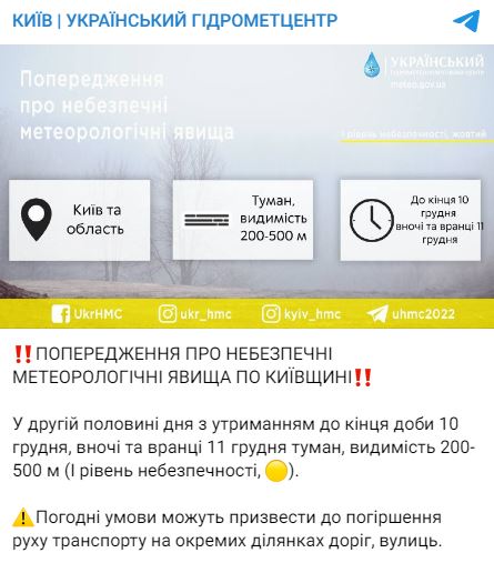 "Во второй половине дня до конца суток 10 декабря, ночью и утром 11 декабря туман, видимость 200-500 метров (I уровень опасности)", - говорится в предупреждении.
