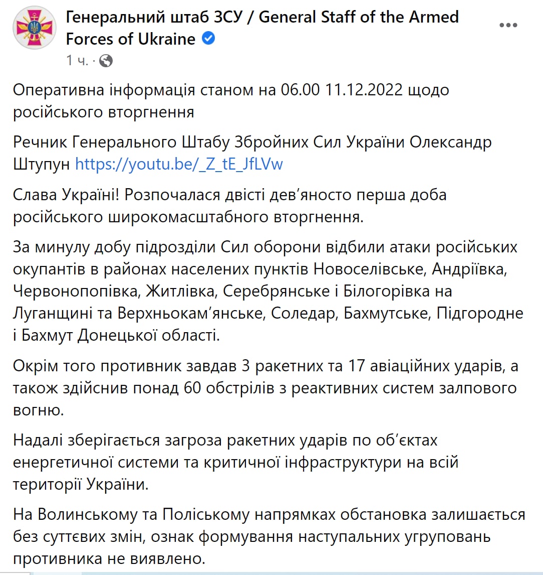 В сравнении с 10 декабря существенно ситуация на фронте не изменилась, однако украинцев предупреждают, что угроза ракетных ударов по энергетической системе страны сохраняется.