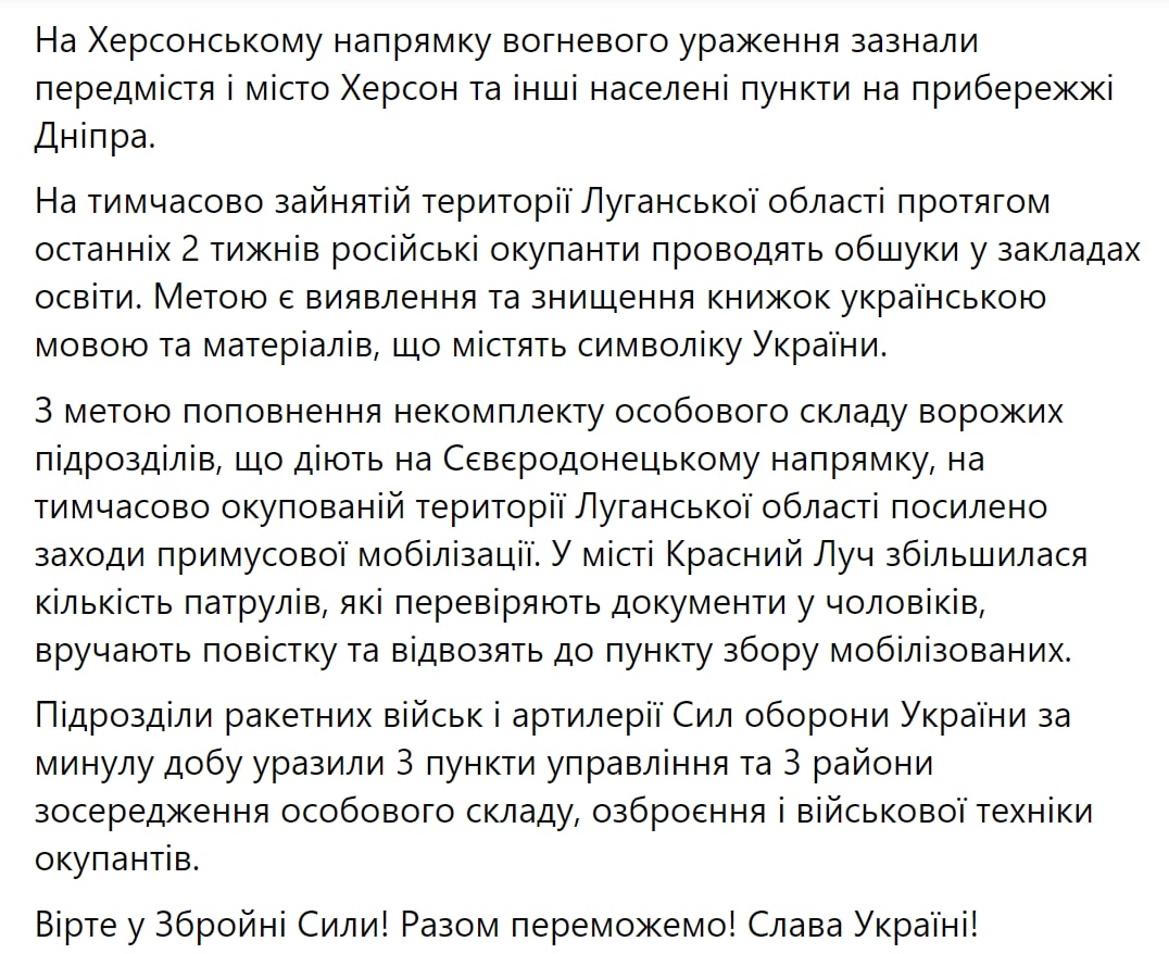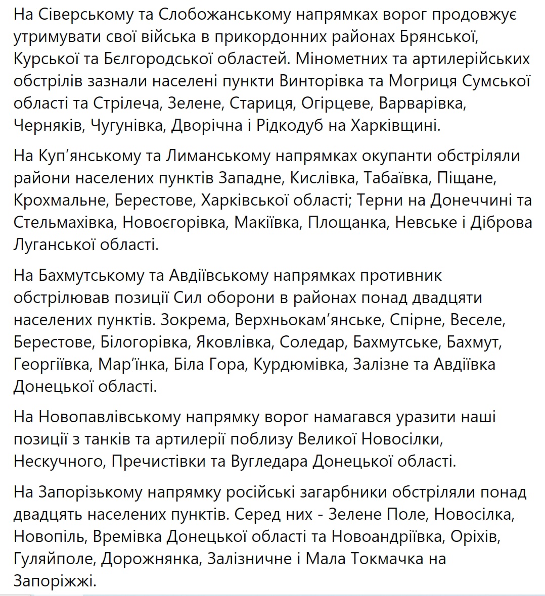 ВСУ за минувшие сутки отразили атаки россиян в районах населенных пунктов: