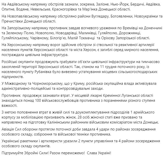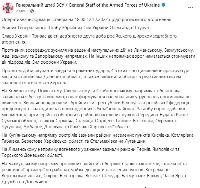 В Генеральном штабе Вооруженных сил Украины опубликовали оперативную сводку с фронта по состоянию на 18:00 12 декабря. Сообщается, что российские войска наступают под Лиманом, Бахмутом, Авдеевкой, Запорожьем и обстреливают Херсон.