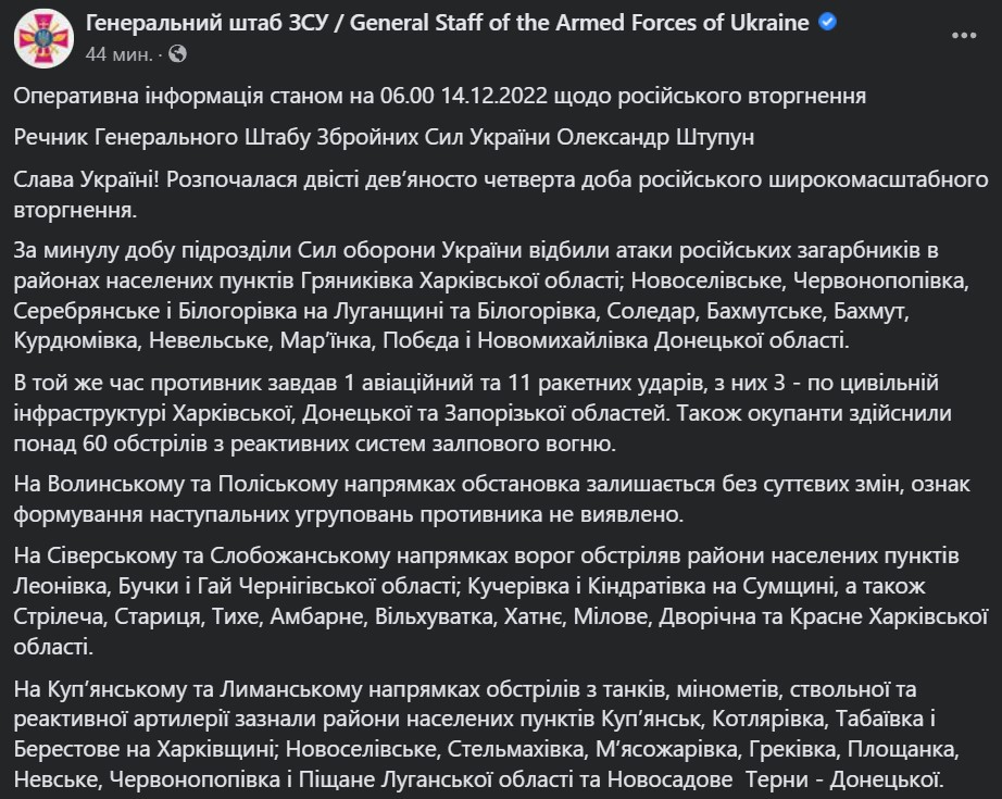 Война в Украине продолжается уже 294-й день. "Страна" следит за новостями 14 декабря в своем онлайне.