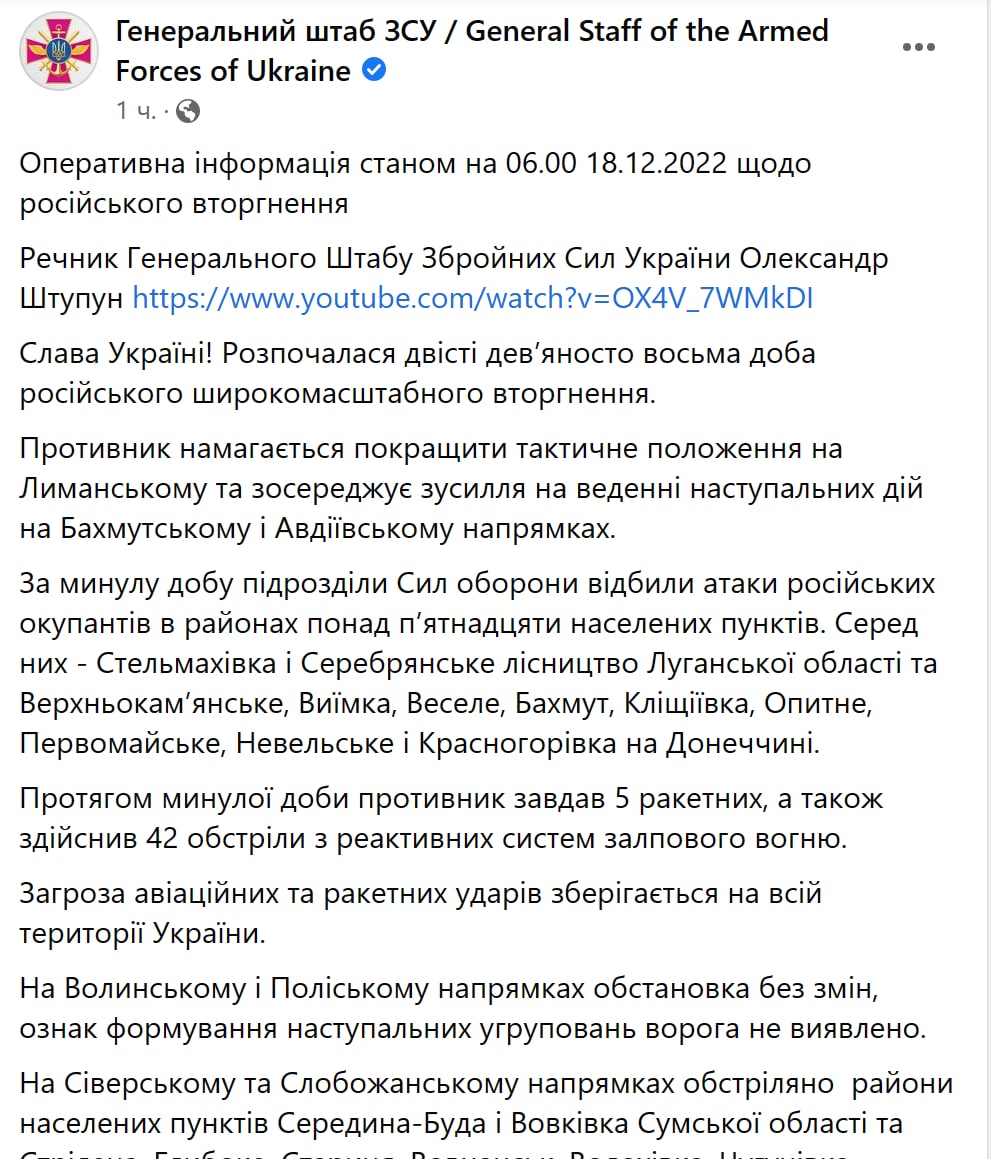 Сводка Генштаба ВСУ по состоянию на 18:00 18 декабря 2022 года