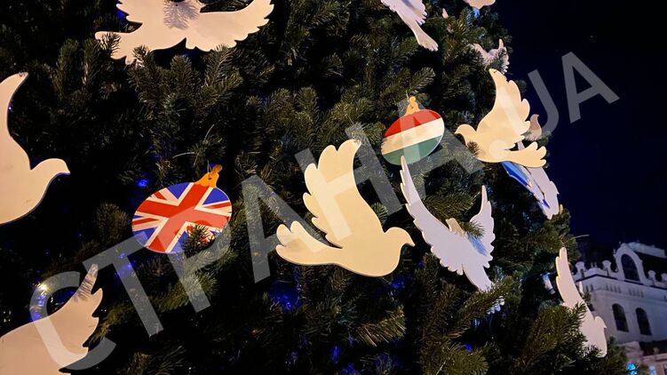 На новогоднем дереве развесили фигурки белых голубей и шары с флагами стран, которые помогают Украине в войне. Возле елке установлена фигура ангела-хранителя. Венчает дерево не традиционная звезда, а трезубец.