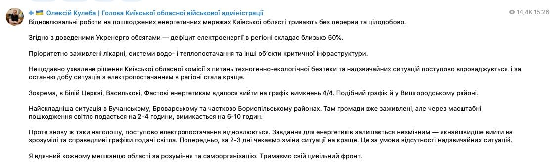 По данным главы Киевской ОВА Алексея Кулебы, дефицит электроэнергии в регионе составляет около 50% (ранее было 80%).