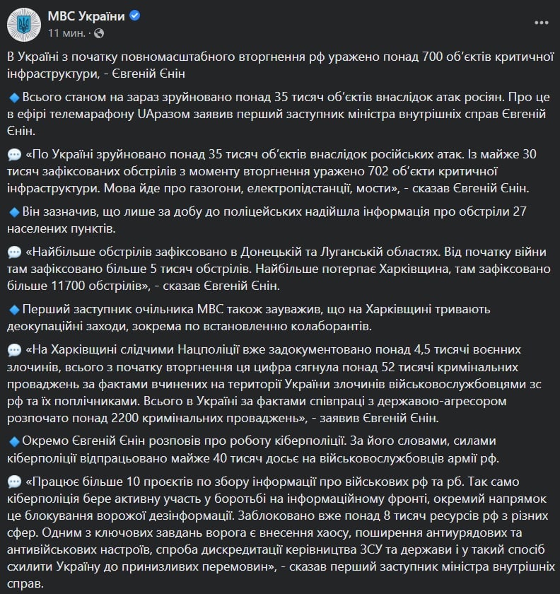 Енин отметил, что только за сутки полицейским поступила информация об обстрелах 27 населенных пунктов. "Больше всего обстрелов зафиксировано в Донецкой и Луганской областях. С начала войны там зафиксировано более 5 тысяч обстрелов. Больше всего страдает Харьковщина, там зафиксировано более 11 700 обстрелов", - сказал Евгений Енин.