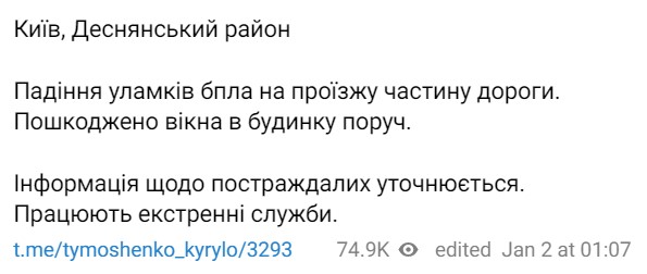 В столице, в Деснянском районе, в результате ночной атаки беспилотник упал на проезжую часть.