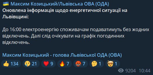 Также не планируется отключать свет до 16:00 в Черкасской области, сообщил губернатор области Игорь Табурец.
