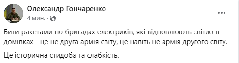 "Бить ракетами по бригадам электриков, восстанавливающим свет в домах – это не вторая армия мира, это даже не армия второго мира. Это историческая стыдоба и слабость", - написал Гончаренко.
