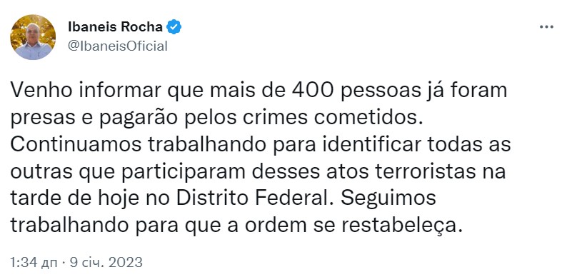 "Более 400 человек уже арестованы и поплатятся за совершенные преступления. Мы продолжаем работу по выявлению всех остальных, кто участвовал в этих терактах сегодня днем ​​в Федеральном округе", - написал он.