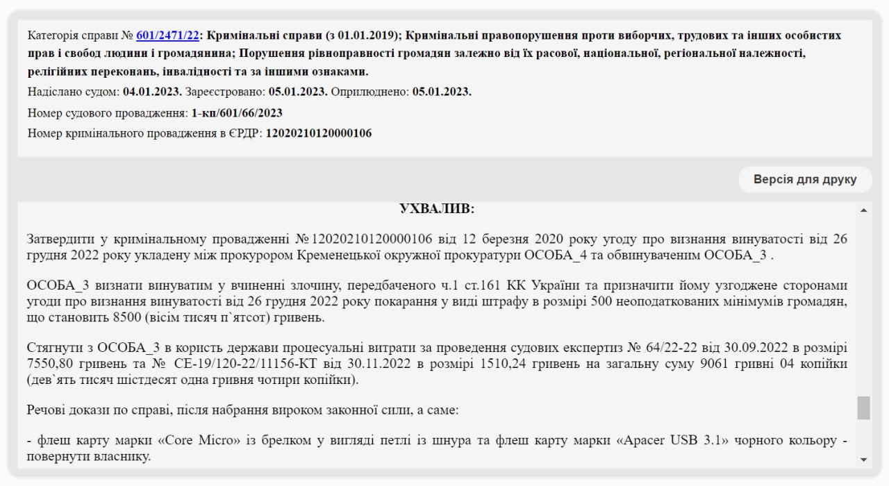 Заседание по этому делу прошло 4 января. Как говорится в приговоре Кременецкого райсуда, судья Наталья Шульгач утвердила соглашение и признала Смакоуза виновным в нарушении ч.1 ст. 161 УК (разжигание религиозной розни), назначив ему 8,5 тыс. грн штрафа.