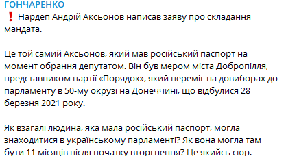 Победивший в 2021 году на довыборах в Раду нардеп Андрей Аксенов написал заявление о сложении мандата.