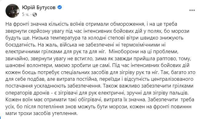 "Низкая температура и холодные степные ветры быстро снижают боеспособность. К сожалению, войска не снабжены ни термохимическими, ни электрическими грелками для рук и для ног. Минобороны на эти проблемы, конечно, обратить внимание не успело, зима, как всегда пришла внезапно. Поэтому уважаемые волонтеры должны сделать это сами. Каждый боец должен иметь специальные средства для обогрева рук и ног", – написал Бутусов.