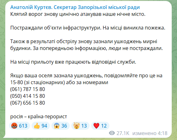 Об этом в телеграм-канале сообщил секретарь Запорожского горсовета Анатолий Куртев.