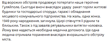 Последствия обстрела Гуляйполя. Фото: Телеграм-канал Александра Старуха