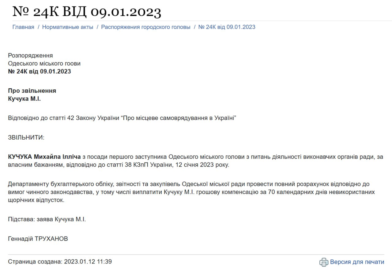 Один из фигурантов "одесского дела" - первый заммэра города Михаил Кучук, который фигурирует в новом "одесском деле" о коррупции местной власти и находится сейчас в Австрии - уволен с занимаемой должности. Распоряжение об этом вышло на сайте мэрии.