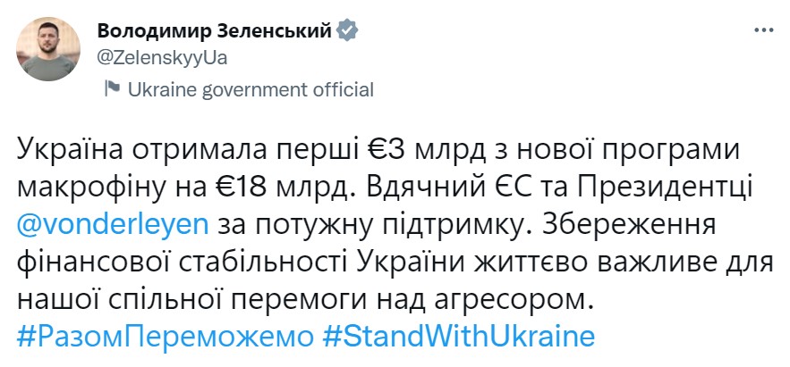 "Украина получила первые 3 млрд евро из новой программы макрофина на EUR 8 млрд. Благодарен ЕС и президенту Еврокомиссии Урсуле фон дер Ляйен за мощную поддержку. Сохранение финансовой стабильности Украины жизненно важно для нашей совместной победы над агрессором", - написал Зеленский.
