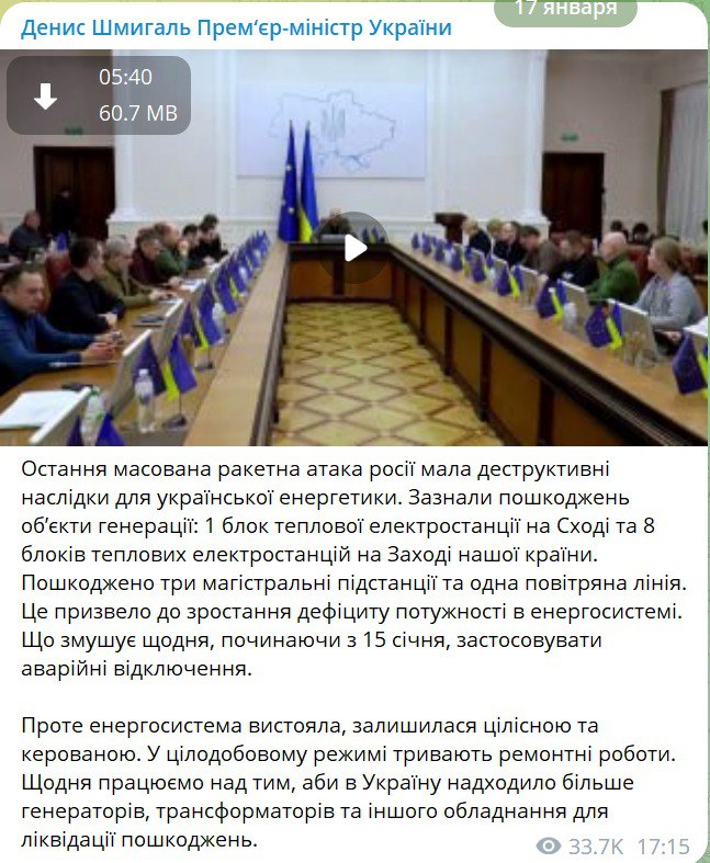 "Потерпели повреждения объекты генерации: один блок тепловой электростанции на востоке и восемь блоков тепловых электростанций на западе нашей страны. Повреждены три магистральные подстанции и одна воздушная линия. Это привело к росту дефицита мощности в энергосистеме. Что заставляет каждый день, начиная с 15 января, применять аварийные отключения", – сообщил премьер.
