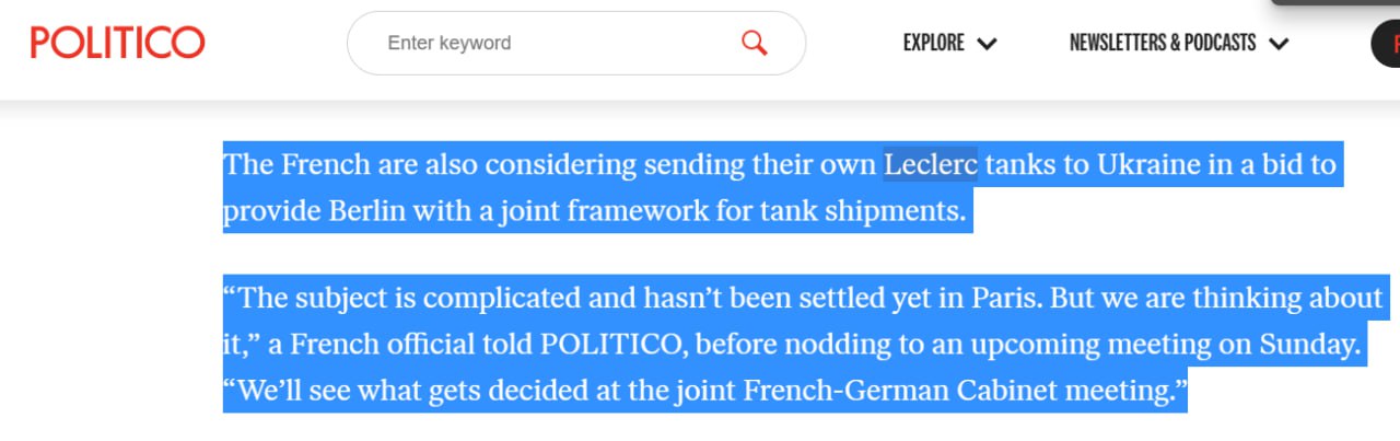 08:57 Франция рассматривает возможность отправки в Украину танков Leclerc, пишет американская газета Politico со ссылкой на неназванного французского чиновника.