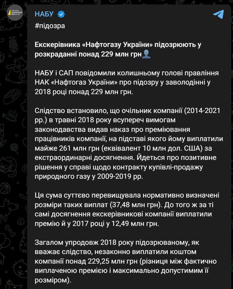 Следствие установило, что глава компании в мае 2018 издал незаконный приказ о премировании самого себя на 261 миллион гривен (эквивалент 10 миллионов долларов).