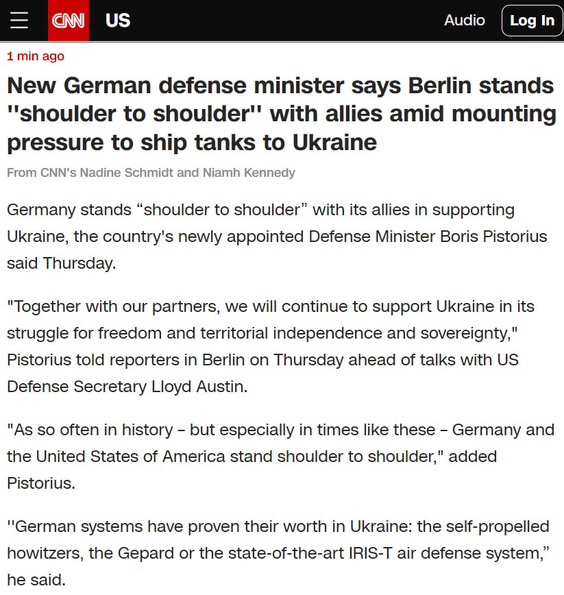 22.42 Глава Минобороны Германии допустил отправку танков Leopard 2 Украине, но не уточнил сроки.