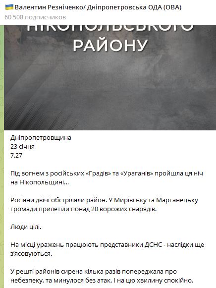 07.35 Ночью Никопольский район Днепропетровской области вновь подвергся обстрелу РФ.
