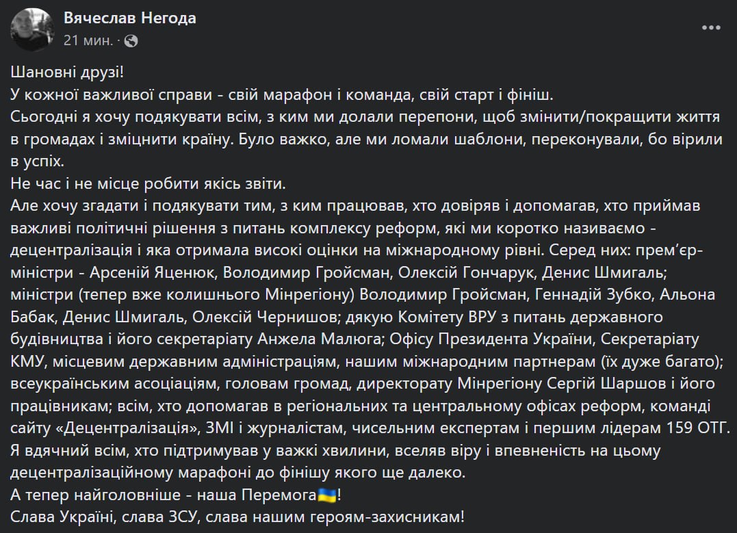 Замминистра развития громад и территорий Вячеслав Негода заявил о том, что уходит в отставку.