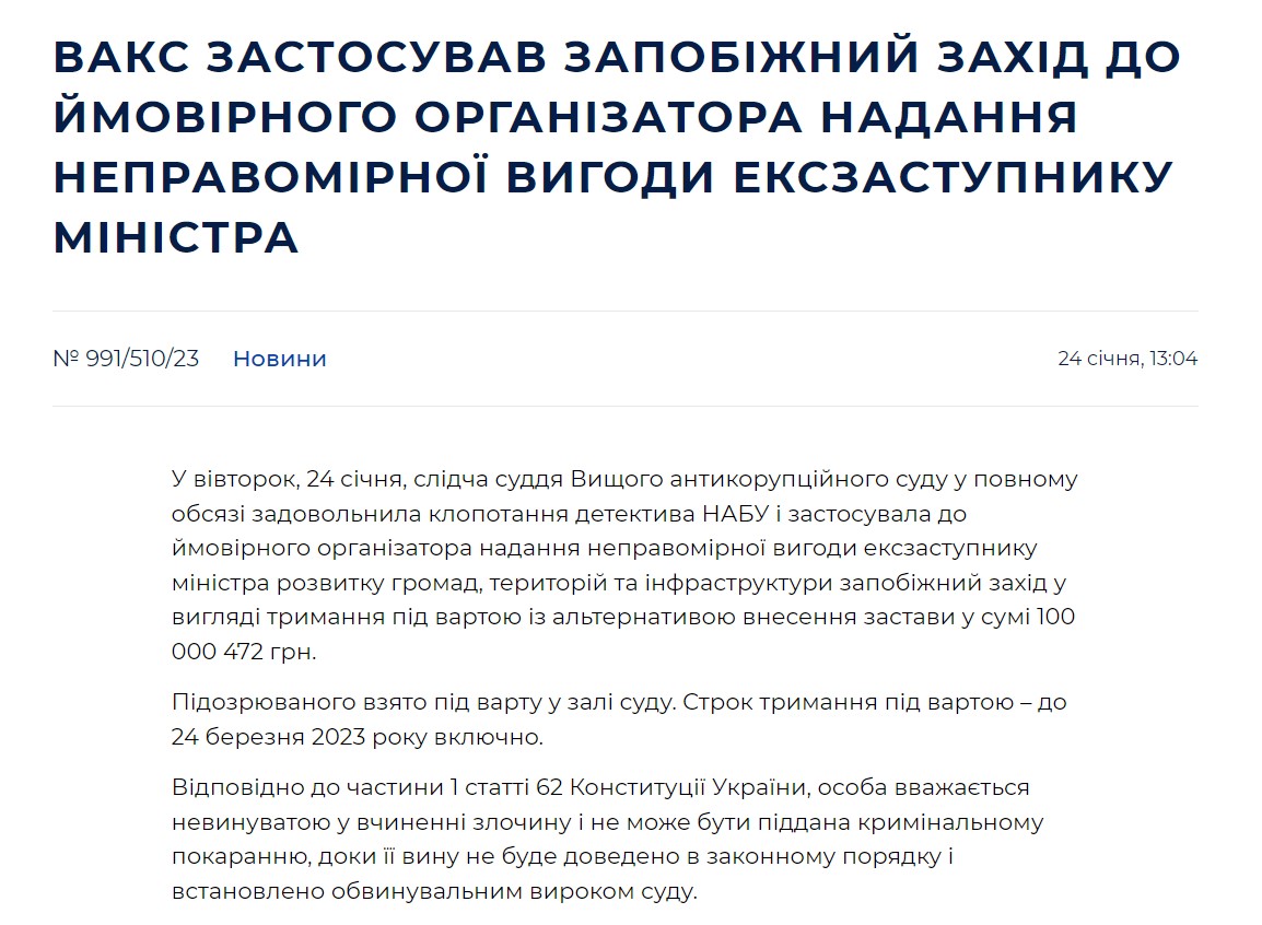 Напомним, 22 января НАБУ официально подтвердило задержание заместителя министра развития громад, территорий и инфраструктуры на получении взятки в 400 тыс. долларов.